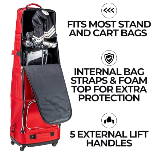 Spacious: Our golf travel covers have a spacious interior and foldable design for holding a full-size cart bag with clubs for convenient storage; they have a 6-wheel base and can be moved vertically using 4 swivel wheels or rolled on 2 in-line skate wheels